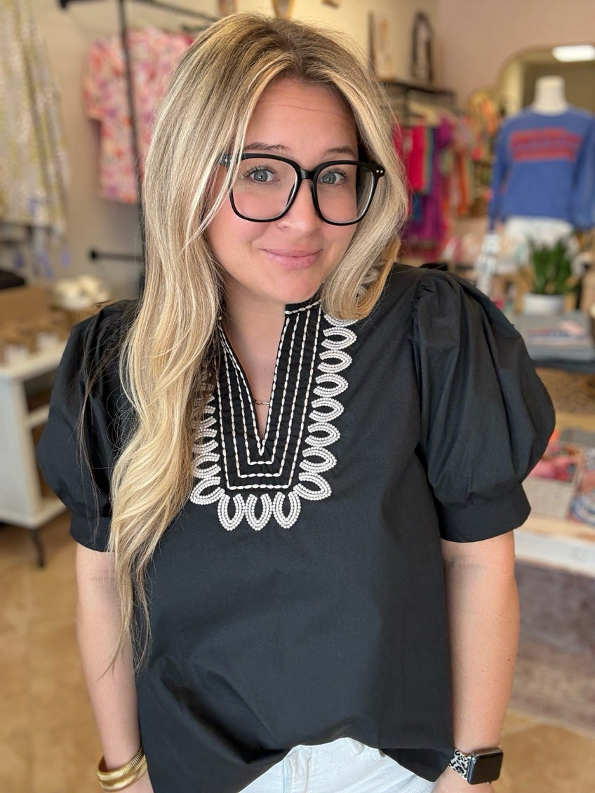 Brighten your wardrobe with this beautiful indigo blue blouse, designed with short puff sleeves and cuffed band hems for a flattering, feminine silhouette. The embroidered V-neck with band collar adds a touch of detail that feels both effortless and elevated. Lightweight and breathable, this woven pullover is perfect for workdays, brunches, or evenings out—style it with crisp white denim or tailored trousers for a chic finish.