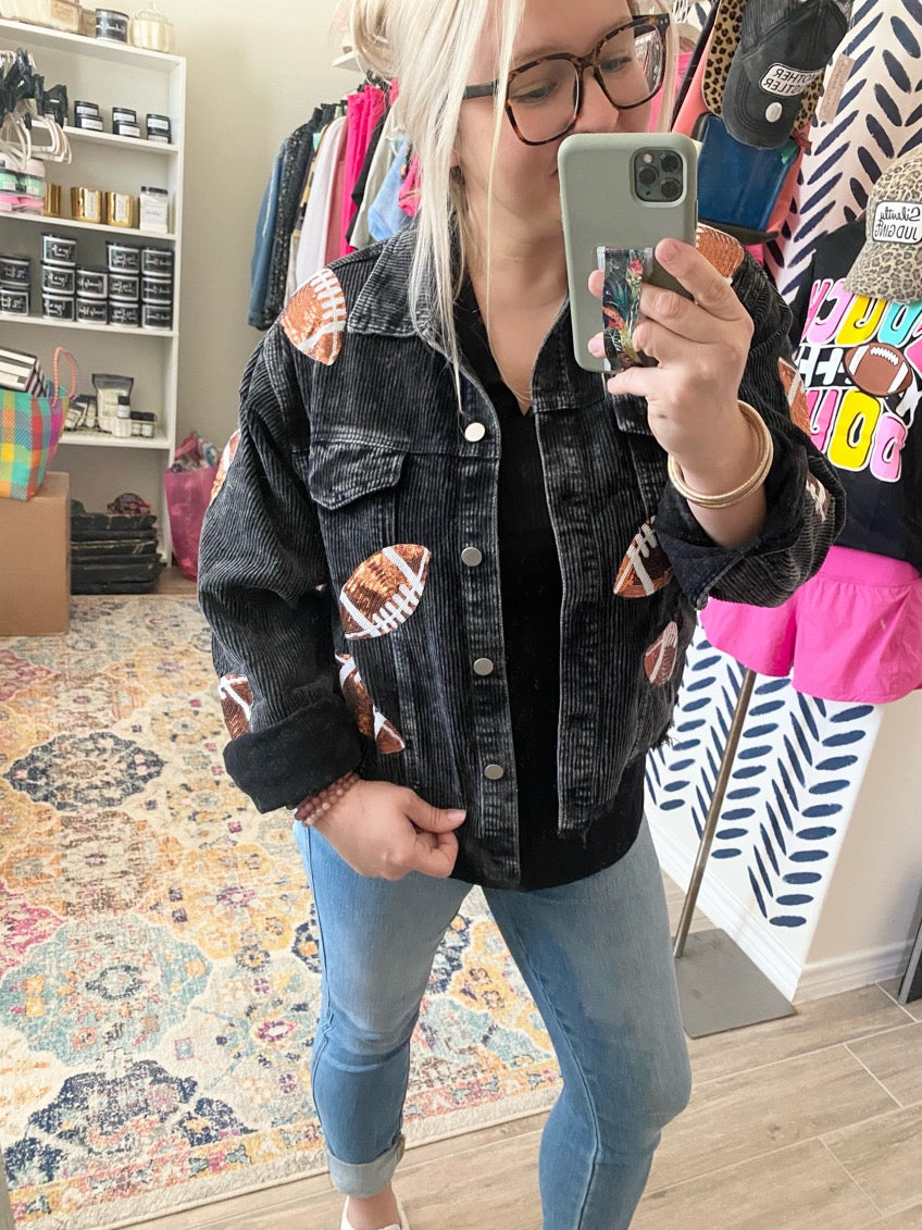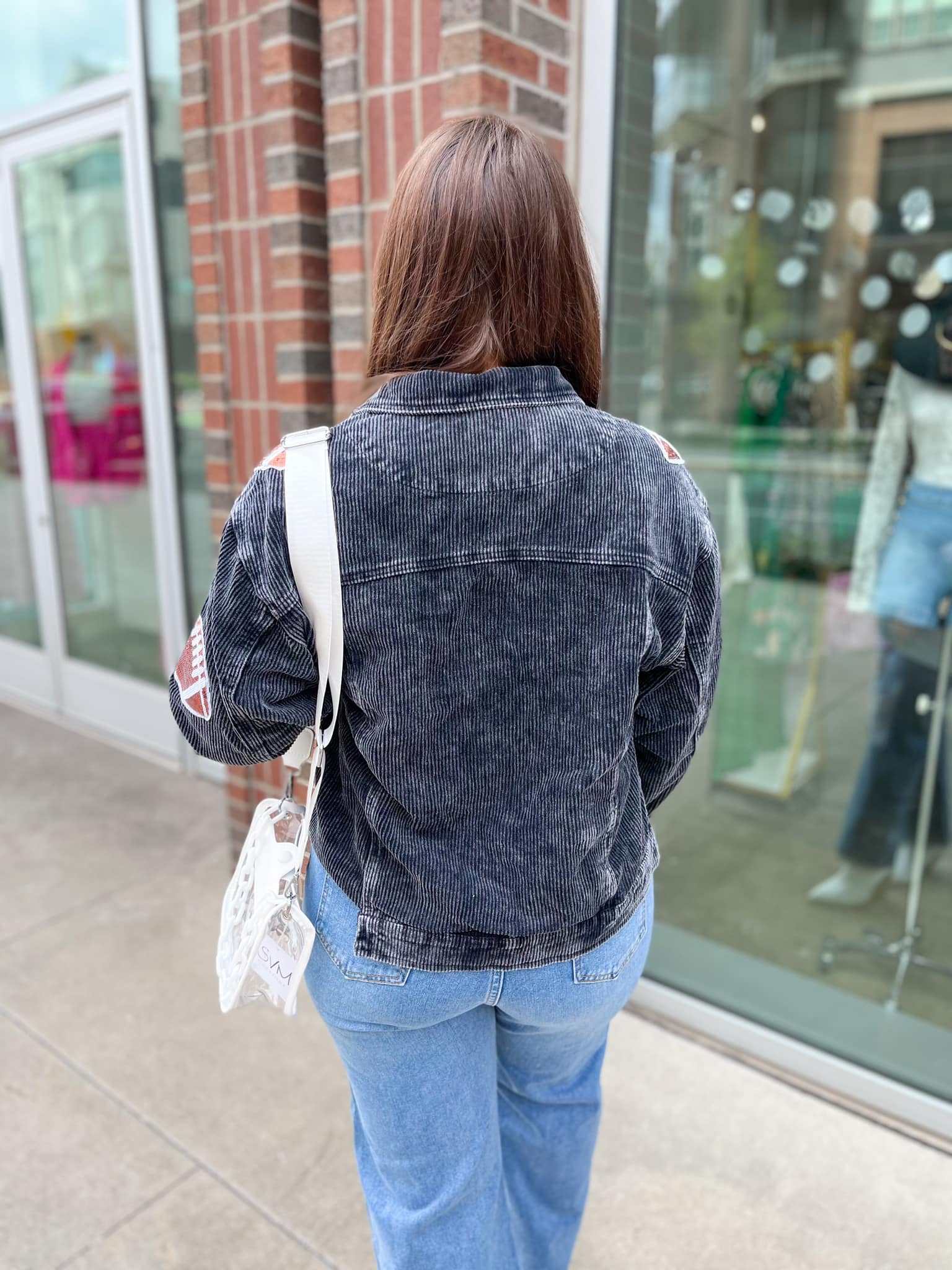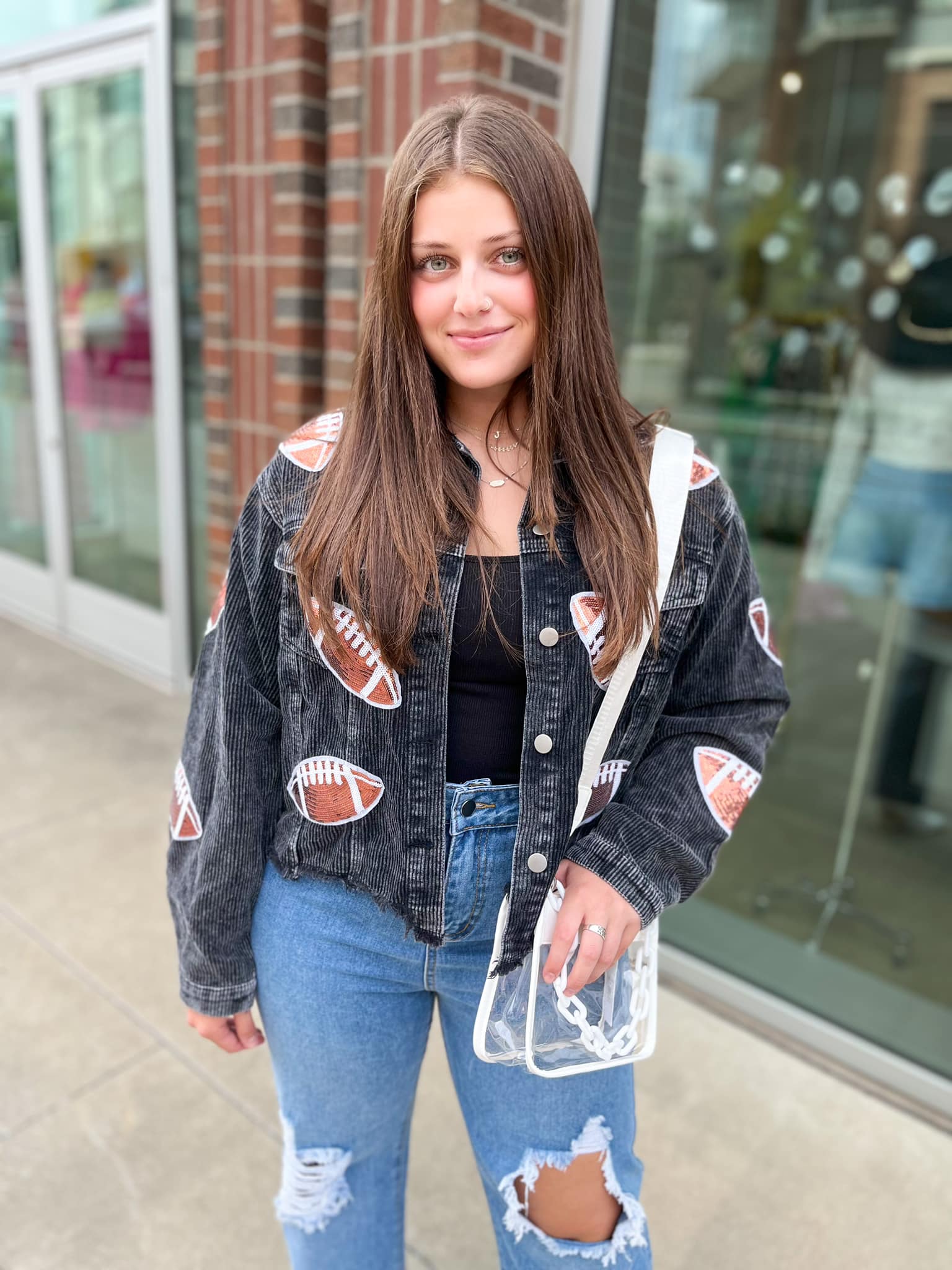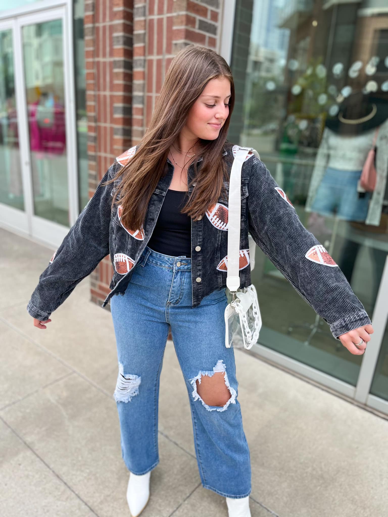 It's time for Friday night lights, chilly fall air, bleachers and cheering on your favorite team! Layer over a tee with denim for the perfect game time look! Features a raw unfinished him on the front/sides.