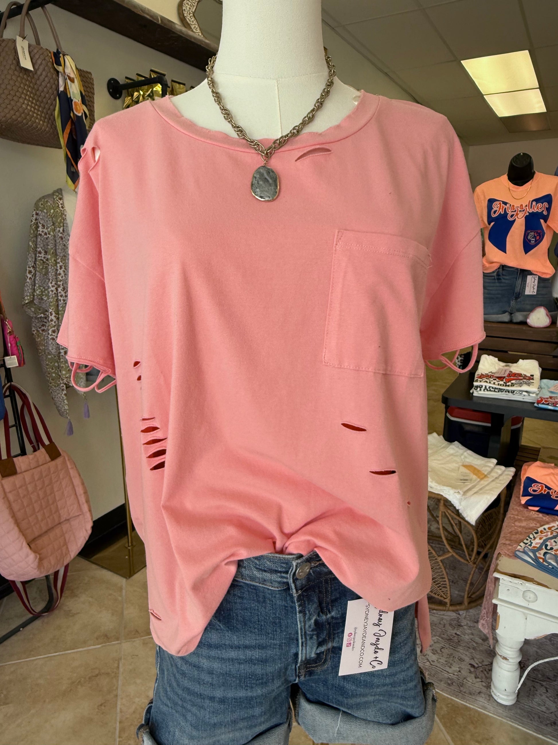 Your favorite tee is back—better than ever and in two new dreamy shades! This best-selling boxy oversized tee is the definition of cozy-chic. Crafted from an ultra-soft, stretchy fabric, it features just the right amount of distressing, a classic chest pocket, and side slits with a flattering high-low hem. Available in bubblegum pink and sage green, it's effortlessly cool and pairs with everything.