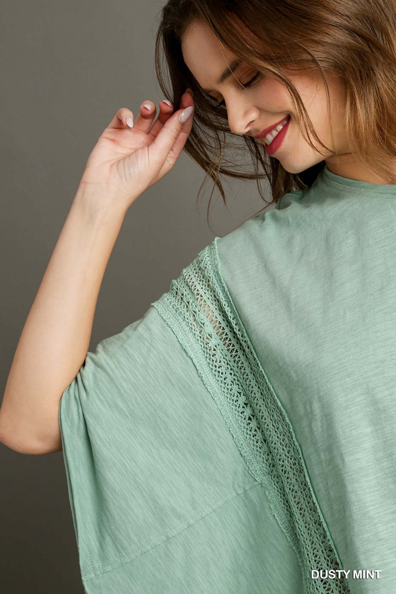 This dusty mint slub cotton knit top is full of charming details- from the lace trim to the raw cut edge accents. It’s feminine without being fussy.